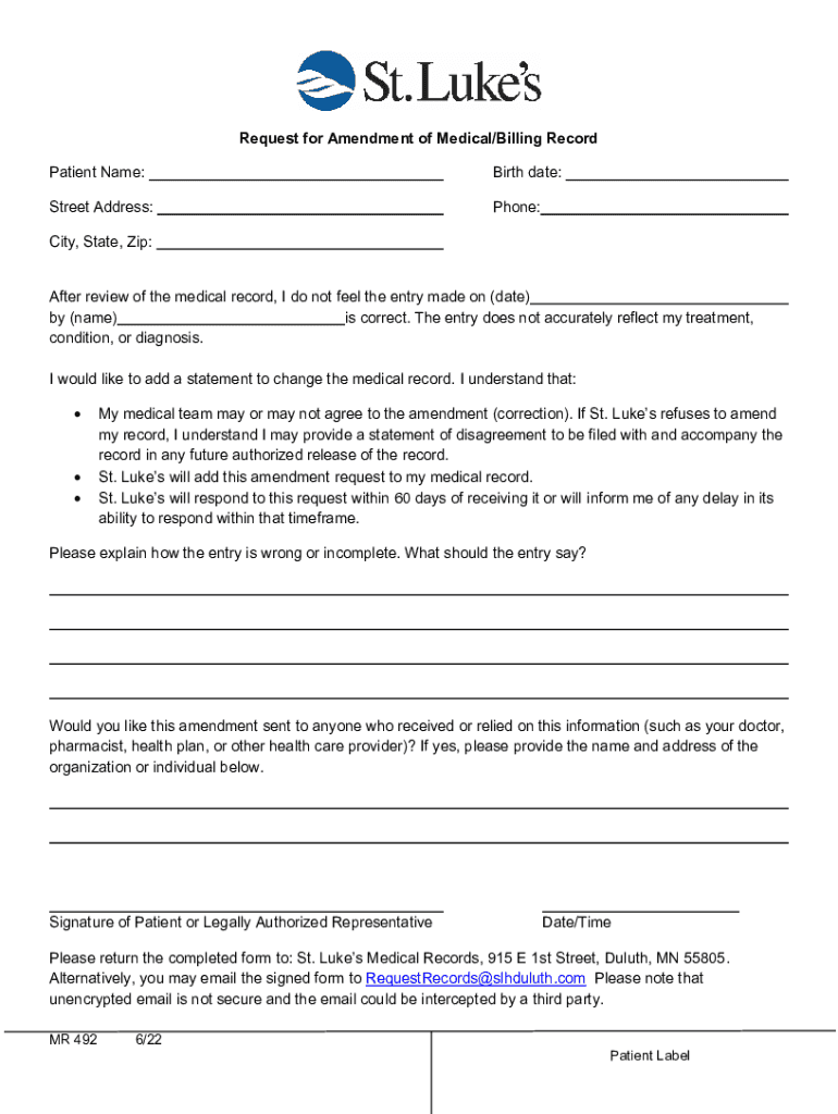 Get the free Request for Amendment of Medical/Billing Record - Duluth