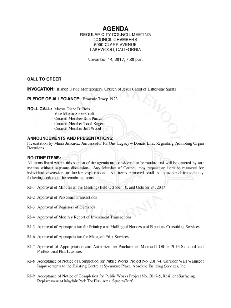 AGENDA REGULAR CITY COUNCIL MEETING COUNCIL CHAMBERS 5000 CLARK AVENUE LAKEWOOD, CALIFORNIA November 14, 2017, 7:30 p.m.CALL TO ORDER INVOCATION: Bishop David Montgomery, Church of Jesus Christ of