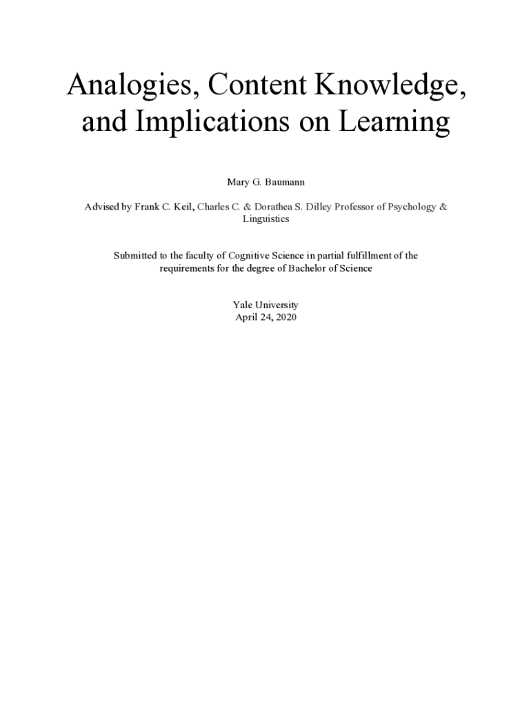 Analogies, Content Knowledge, and Implications on Learning Mary G. Baumann Advised by Frank C. Rail, Charles C. & Dorothea S. Villa Professor of Psychology & Linguistics Submitted to the faculty of