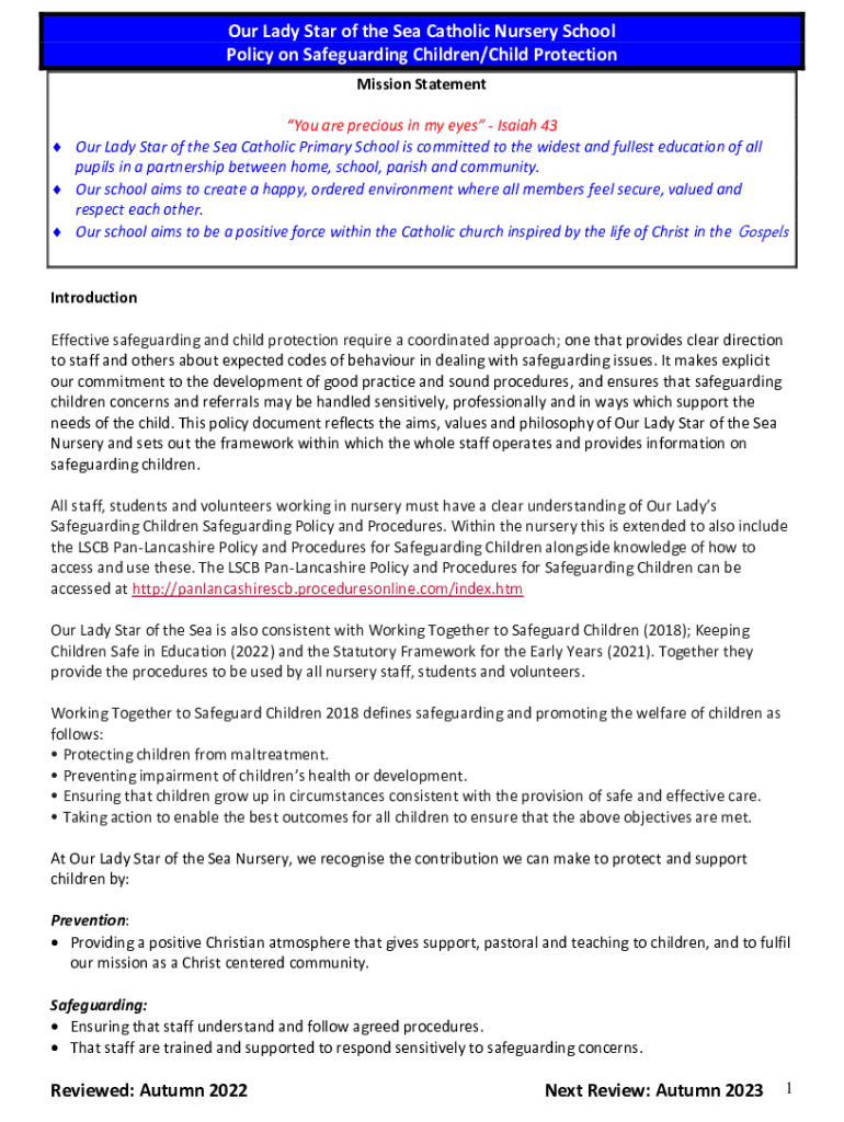 Our Lady Star of the Sea Catholic Nursery School Policy on Safeguarding Children/Child Protection Mission Statement You are precious in my eyes Isaiah 43 Our Lady Star of the Sea Catholic Primary