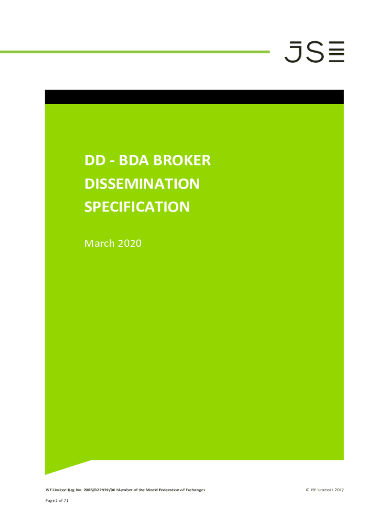 DD BDA BROKER DISSEMINATION SPECIFICATION March 2020JSE Limited Reg No: 2005/022939/06 Member of the World Federation of Exchanges Page 1 of 71 USE Limited I 2017Table of Contents 1 2 3 4 4.1 4.2