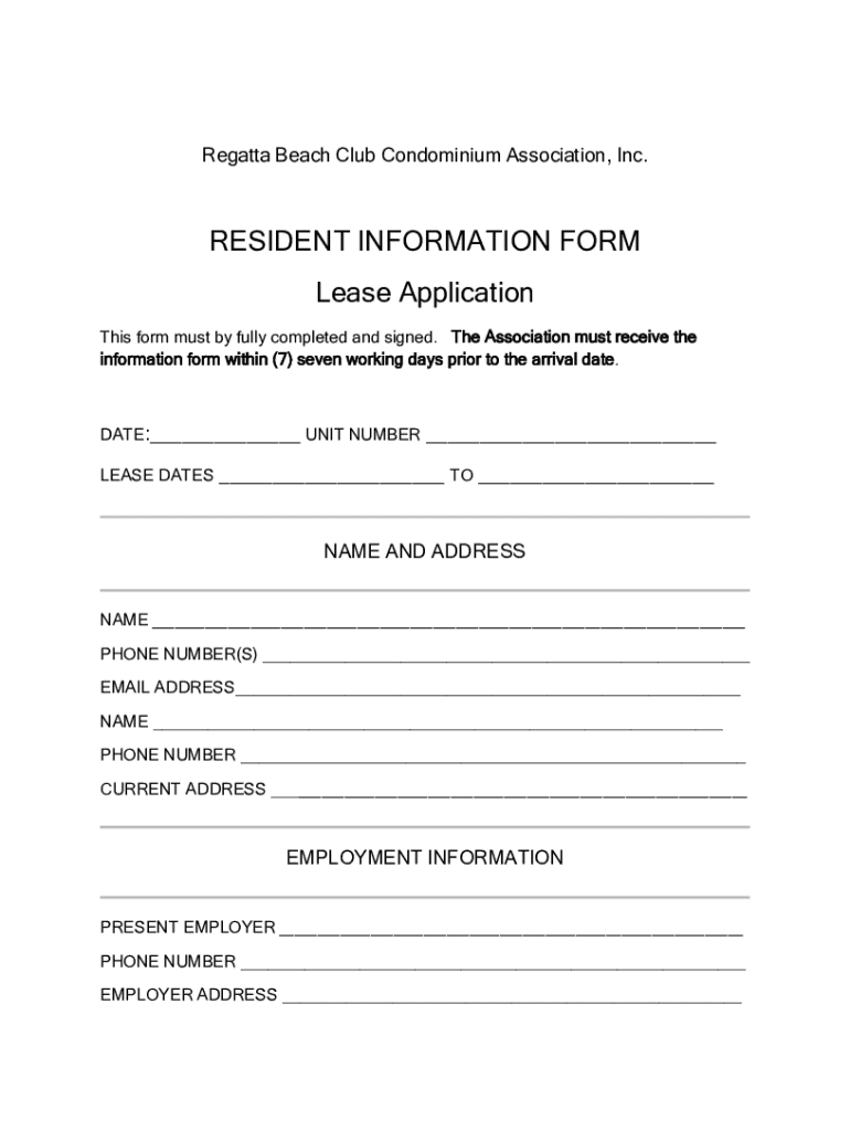 Regatta Beach Club Condominium Association, Inc. RESIDENT INFORMATION FORM Lease Application This form must buy fully completed and signed. The Association must receive the information form within