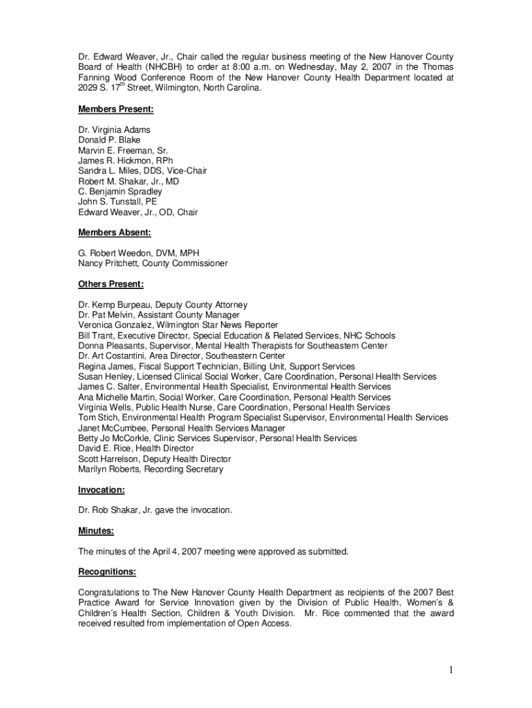 Dr. Edward Weaver, Jr., Chair called the regular business meeting of the New Hanover County