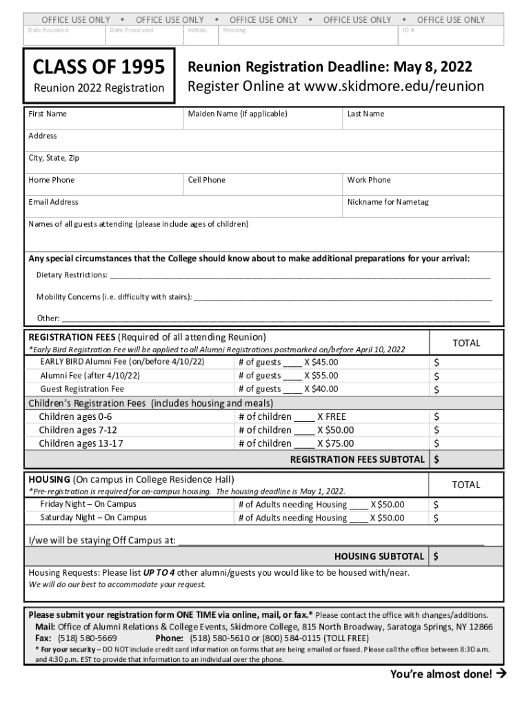 Reunion 2022 RegistrationFirst NameInitialsOFFICE USE ONLYHousingOFFICE USE ONLY
