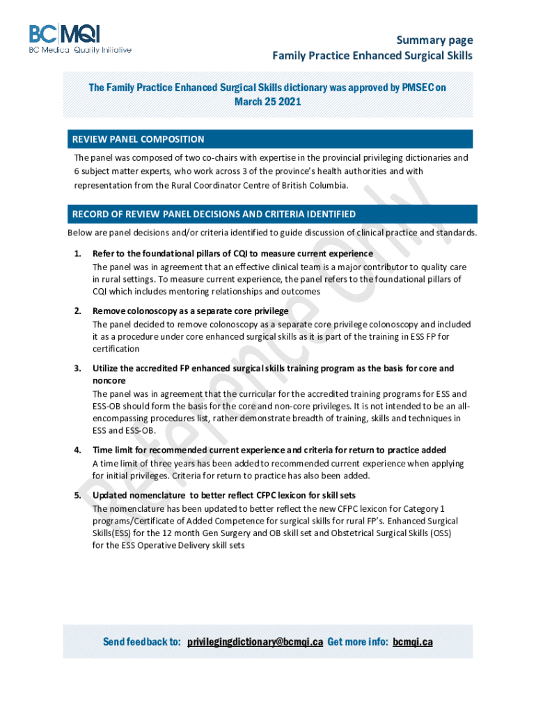 Summary page Family Practice Enhanced Surgical Skills The Family Practice Enhanced Surgical Skills' dictionary was approved by PM SEC on March 25, 2021, REVIEW PANEL COMPOSITION The panel was composed