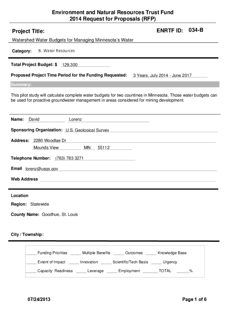 Environment and Natural Resources Trust Fund 2014 Request for Proposals (RFP) EN RTF ID:Project Title:034BWatershed Water Budgets for Managing Minnesota's Water B. WaterResourcesCategory:Total Project