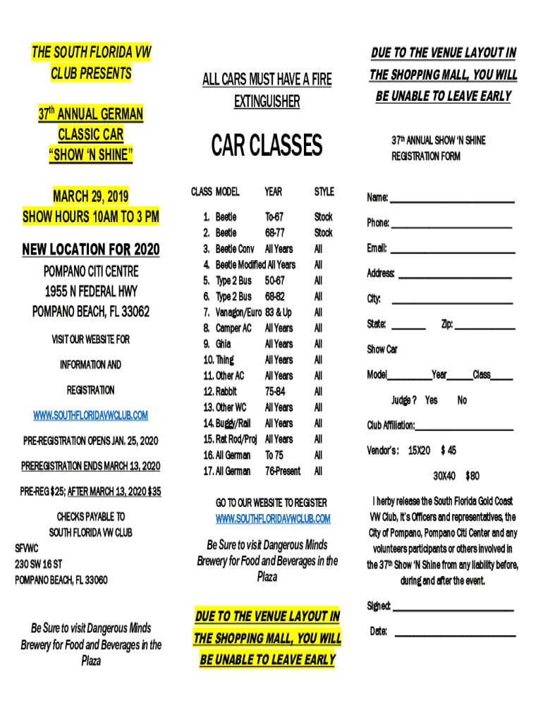 THE SOUTH FLORIDA VW CLUB PRESENTS 37th ANNUAL GERMAN CLASSIC CAR SHOW N SHINE MARCH 29, 2019, SHOW HOURS 10AM TO 3 PM NEW LOCATION FOR 2020 POMPANO CITY Center 1955 N FEDERAL HWY POMPANO BEACH, FL