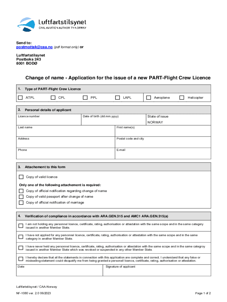 Send to: postmottak@caa.no (PDF format only) or Luftfartstilsynet Postdocs 243 8001 Change of name Application for the issue of a new Earthlight Crew License 1. Type of Earthlight Crew License ATPL2.CPLPPLLAPLAeroplaneHelicopterPersonal