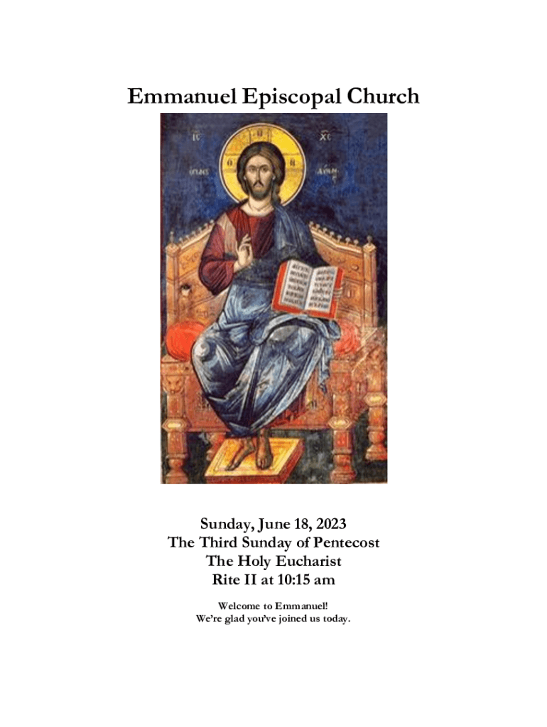Emmanuel Episcopal Church Sunday, June 18, 2023, The Third Sunday of Pentecost The Holy Eucharist Rite II at 10:15 am Welcome to Emmanuel! Were glad you've joined us today. Welcome to Emmanuel! Whether