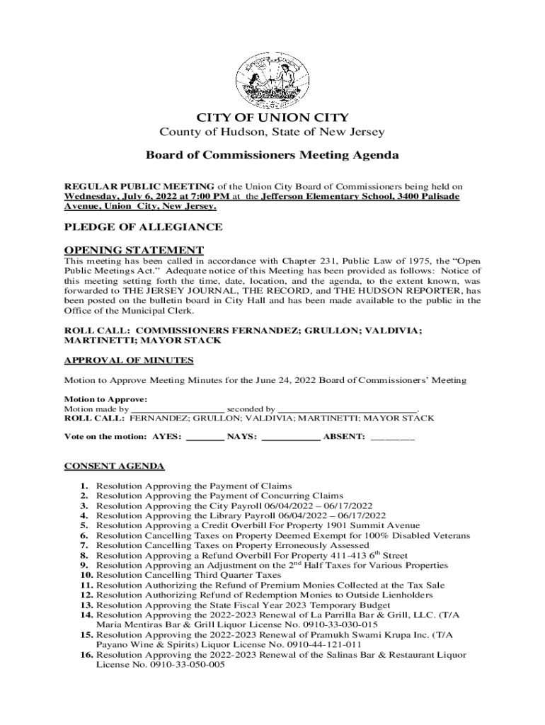 CITY OF UNION CITY County of Hudson, State of New Jersey Board of Commissioners Meeting Agenda REGULAR PUBLIC MEETING of the Union City Board of Commissioners being held on Wednesday, July 6, 2022,