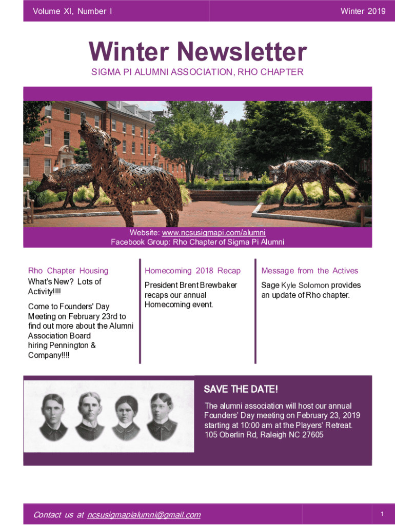 Volume XI, Number Winter 2019Winter Newsletter SIGMA PI ALUMNI ASSOCIATION, RHO CHAPTERWebsite: www.ncsusigmapi.com/alumni Facebook Group: Rho Chapter of Sigma Pi Alumni Rho Chapter Housing What\'s