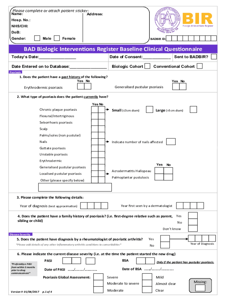 Please complete or attach patient sticker:Name:Address:Hosp. No.: NHS/CHI: DOB: Gender:MaleFemaleBADBIR ID:BAD Biologic Interventions Register Baseline Clinical Questionnaire Today's Date:___Date