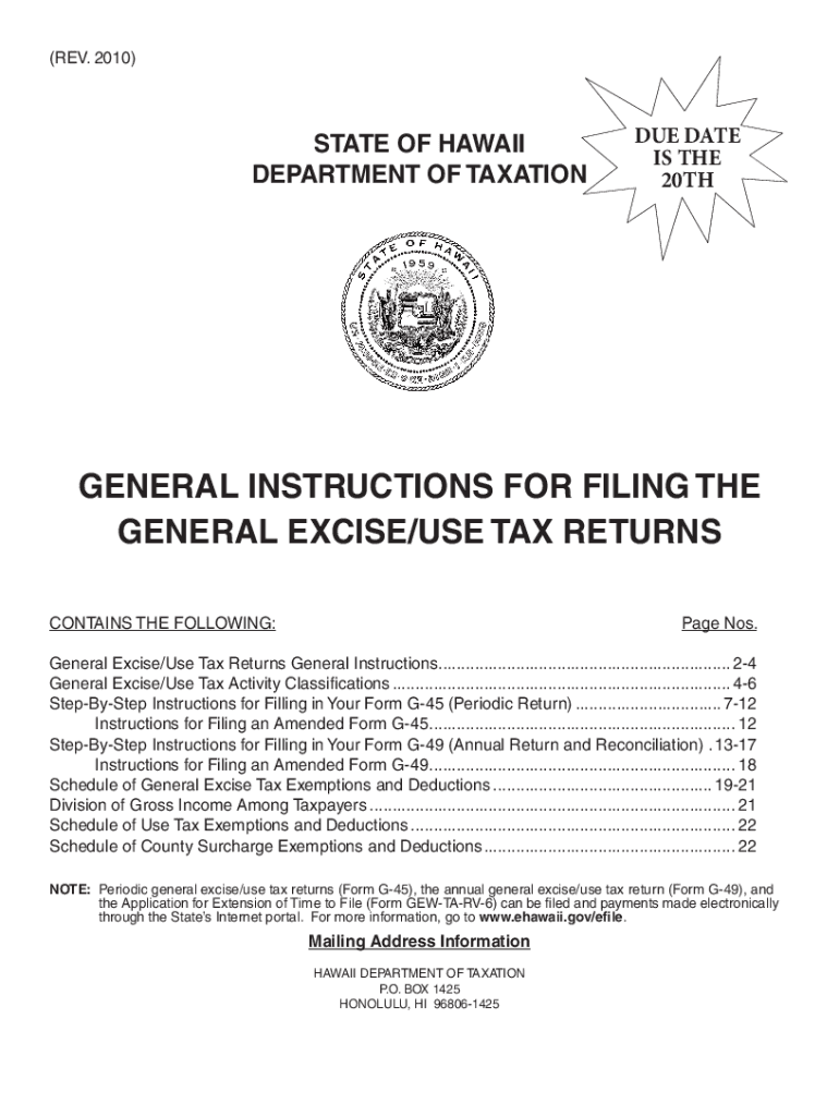 (REV. 2010)STATE OF HAWAII DEPARTMENT OF TAXATION DATE IS THE 20THGENERAL INSTRUCTIONS FOR FILING THE GENERAL EXCISE/USE TAX RETURNS CONTAINS THE FOLLOWING:Page Nos. General Excise/Use Tax Returns