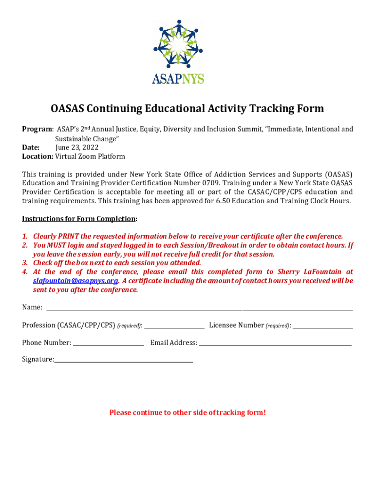 OASIS Continuing Educational Activity Tracking Form Program: ASAP 2nd Annual Justice, Equity, Diversity and Inclusion Summit, Immediate, Intentional and Sustainable Change Date: June 23, 2022, Location: