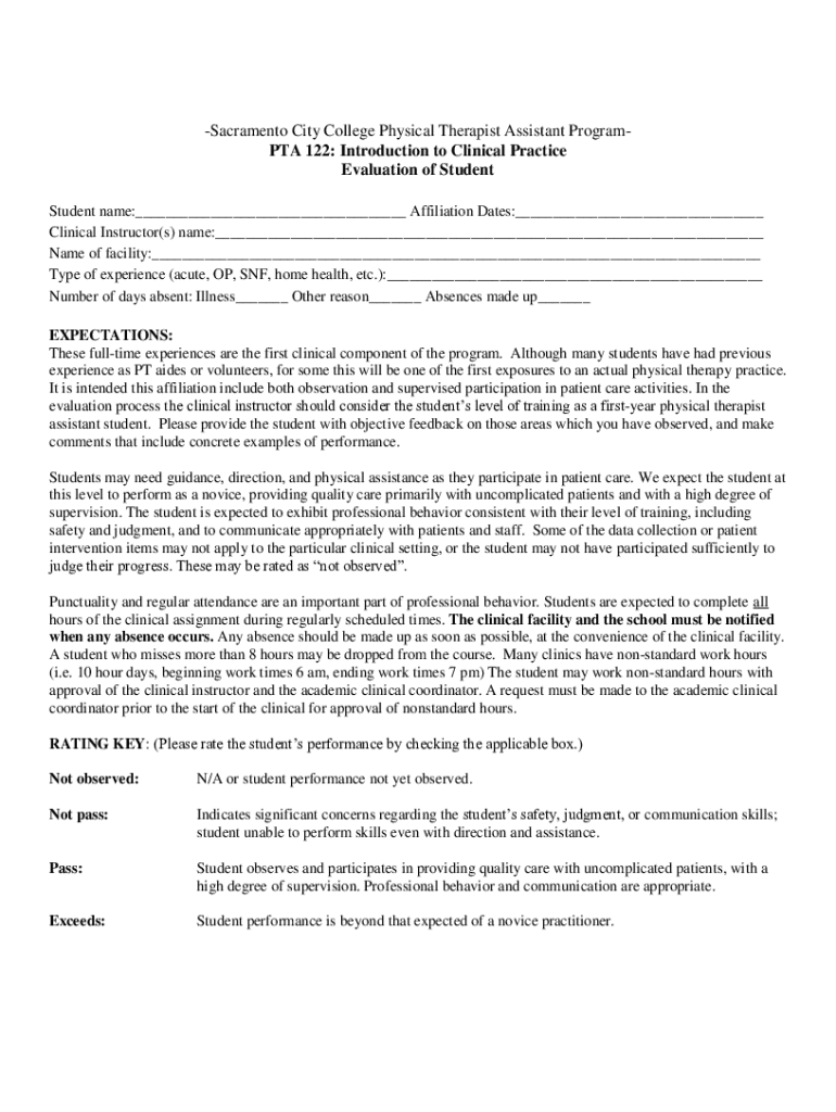 Sacramento City College Physical Therapist Assistant Program PTA 122: Introduction to Clinical Practice Evaluation of Student name:___ Affiliation Dates:___ Clinical Instructor(s) name:___ Name of