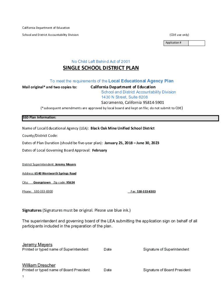 California Department of Education School and District Accountability Division(CDE use only)No Child Left Behind Act of 2001SINGLE SCHOOL DISTRICT PLAN To meet the requirements of the Local Educational