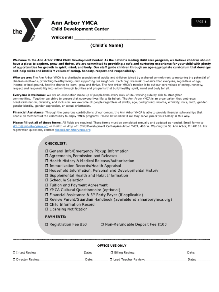 Ann Arbor MANAGE 1Child Development Center Welcome! ___ (Child's Name)Welcome to the Ann Arbor YMCA Child Development Center! As the nations leading child care program, we believe children should
