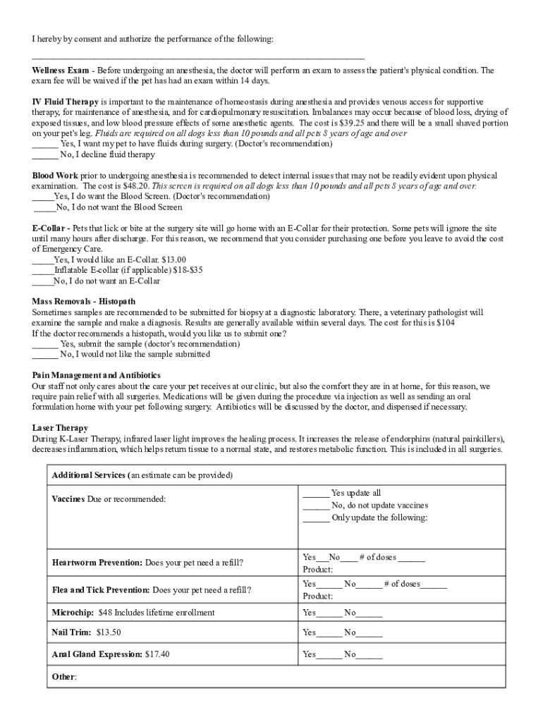 I hereby buy consent and authorize the performance of the following: ___ Wellness Exam Before undergoing an anesthesia, the doctor will perform an exam to assess the patient\'s physical condition.