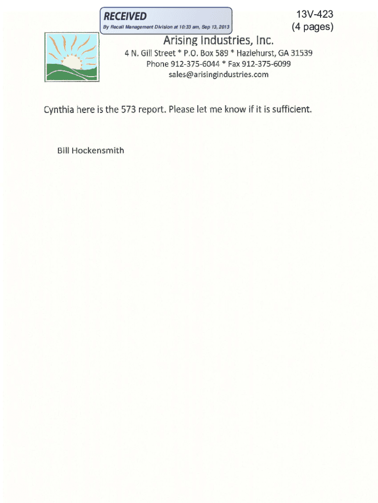 By Recall Management Division at 10:33 am, Sep 13, 201313V423 (4 pages)Arising Industries Inc. 4 N. Gill Street* P.O. Box 589 * Hazlehurst, GA 31539 Phone 9123756044 * Fax 9123756099 sales@arisingindustries.comCynthia