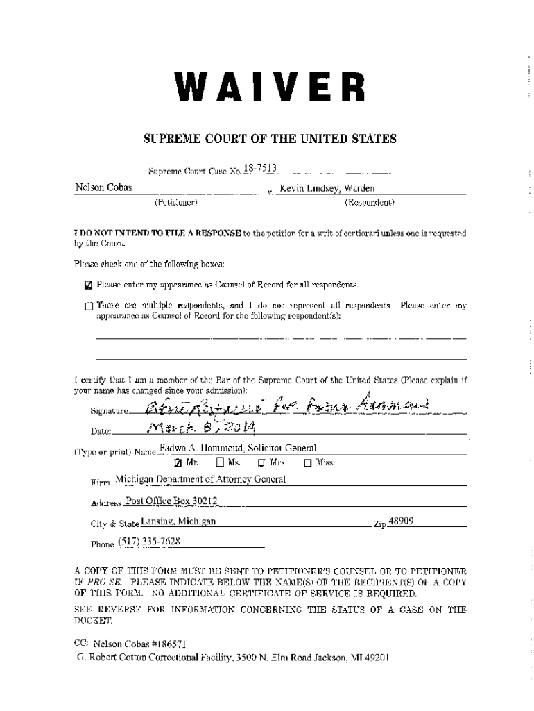 WAIVER SUPREME COURT OF THE United States Supreme Court Case No, _1_8_7_5_1_3_ _ _ _ _ _ _ _ ___N_e_l_so_n_C_o_b_as_ _ _ _ _ _ _ _ _ _ _ _ v. Kevin Lindsey, Warden (Petitioner) (Respondent) I DO NOT