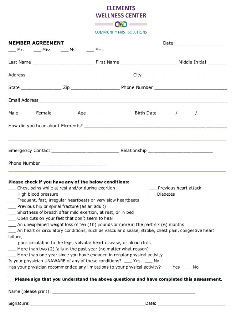 MEMBER AGREEMENT ___ Mr.___ Miss___ Ms. Date: ___ ___ Mrs. Last Name ___ First Name ___ Middle Initial ___ Address ___ City ___ State ___ Zip ___ Phone Number ___ Email Address___ Male___Female___Age