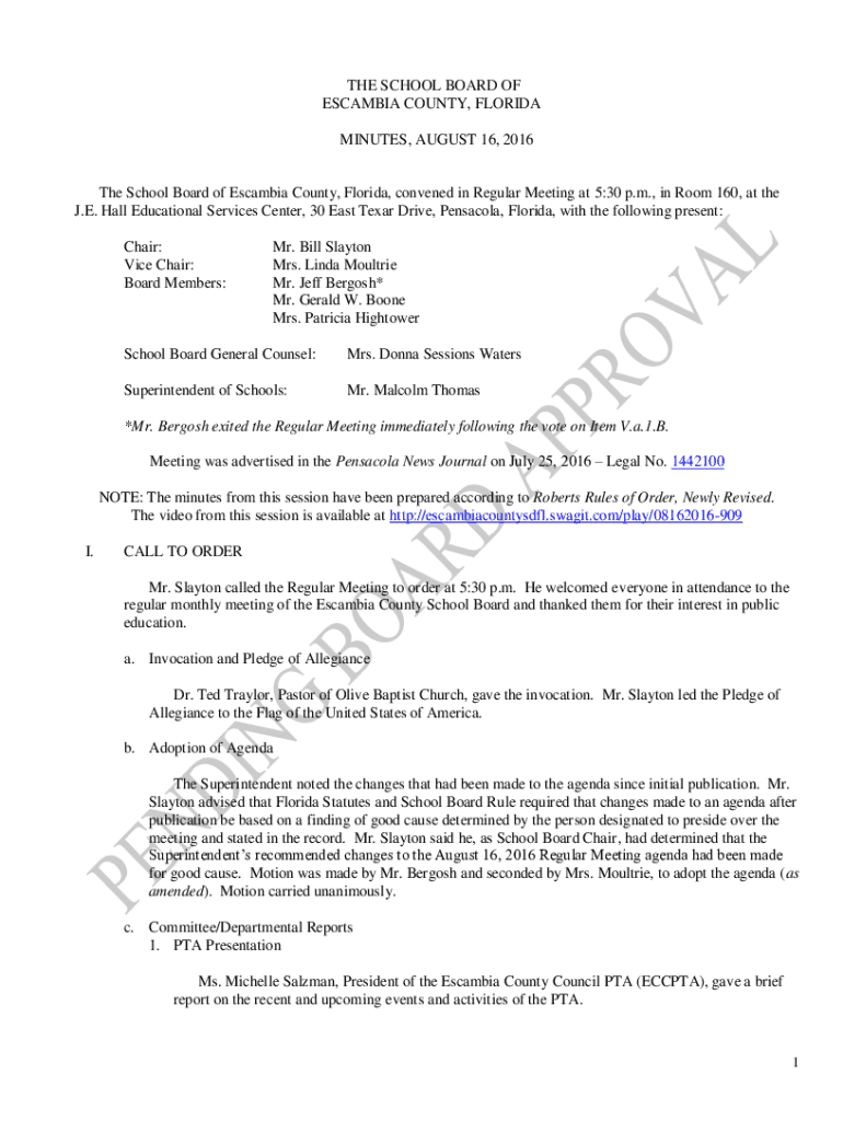 MINUTES, AUGUST 16, 2016The School Board of Escambia County, Florida, convened in Regular Meeting at 5:30 p.m., in Room 160, at the