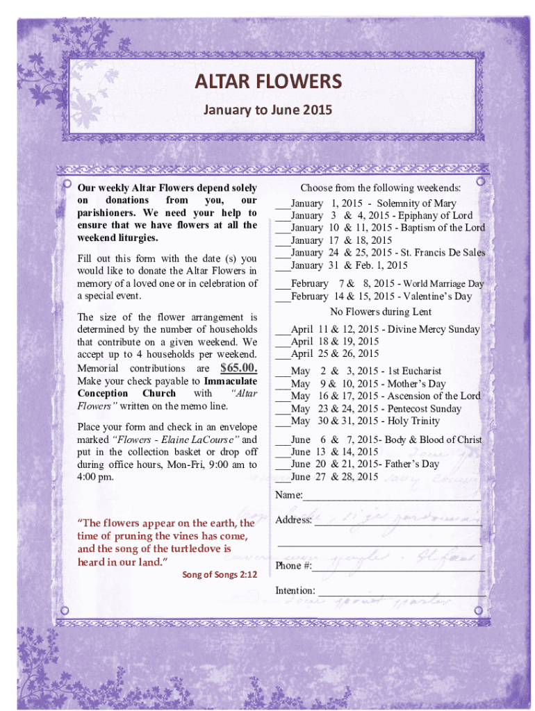 ALTARFLOWERS JanuarytoJune2015Our weekly Altar Flowers depend solely on donations from you, our parishioners. We need your help to ensure that we have flowers at all the weekend liturgies. Fill out