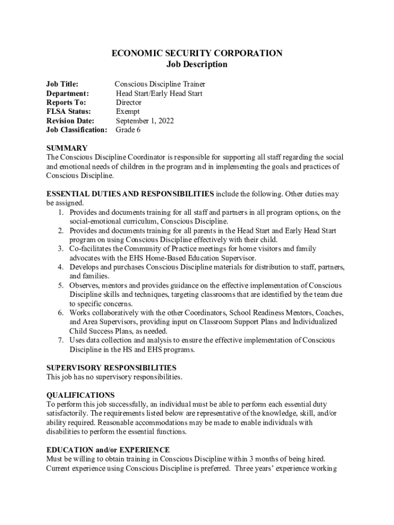 ECONOMIC SECURITY CORPORATION Job Description Job Title: Conscious Discipline Trainer Department: Head Start/Early Head Start Reports To: Director FLEA Status: Exempt Revision Date: September 1, 2022,