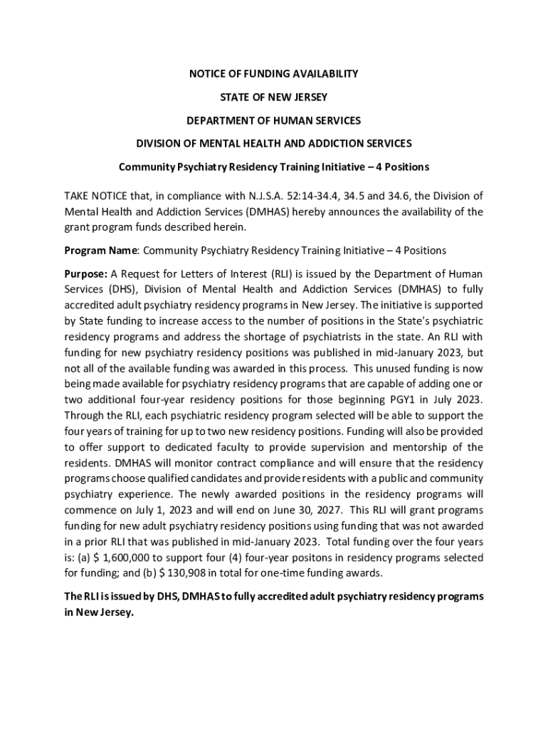 NOTICE OF FUNDING AVAILABILITY STATE OF NEW JERSEY DEPARTMENT OF HUMAN SERVICES DIVISION OF MENTAL HEALTH AND ADDICTION SERVICES Community Psychiatry Residency Training Initiative 4 Positions TAKE