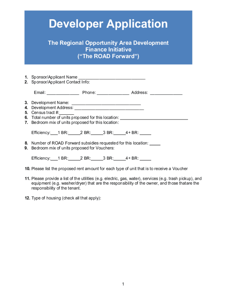 Developer Application The Regional Opportunity Area Development Finance Initiative (The ROAD Forward) 1. Sponsor/Applicant Name ___ 2. Sponsor/Applicant Contact Info: Email: ___ Phone: ___ Address: