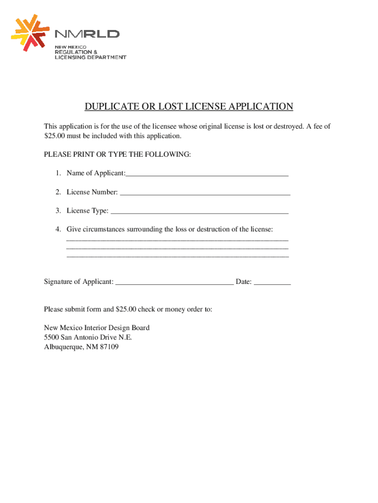 DUPLICATE OR LOST LICENSE APPLICATION This application is for the use of the licensee whose original license is lost or destroyed. A fee of $25.00 must be included with this application. PLEASE PRINT