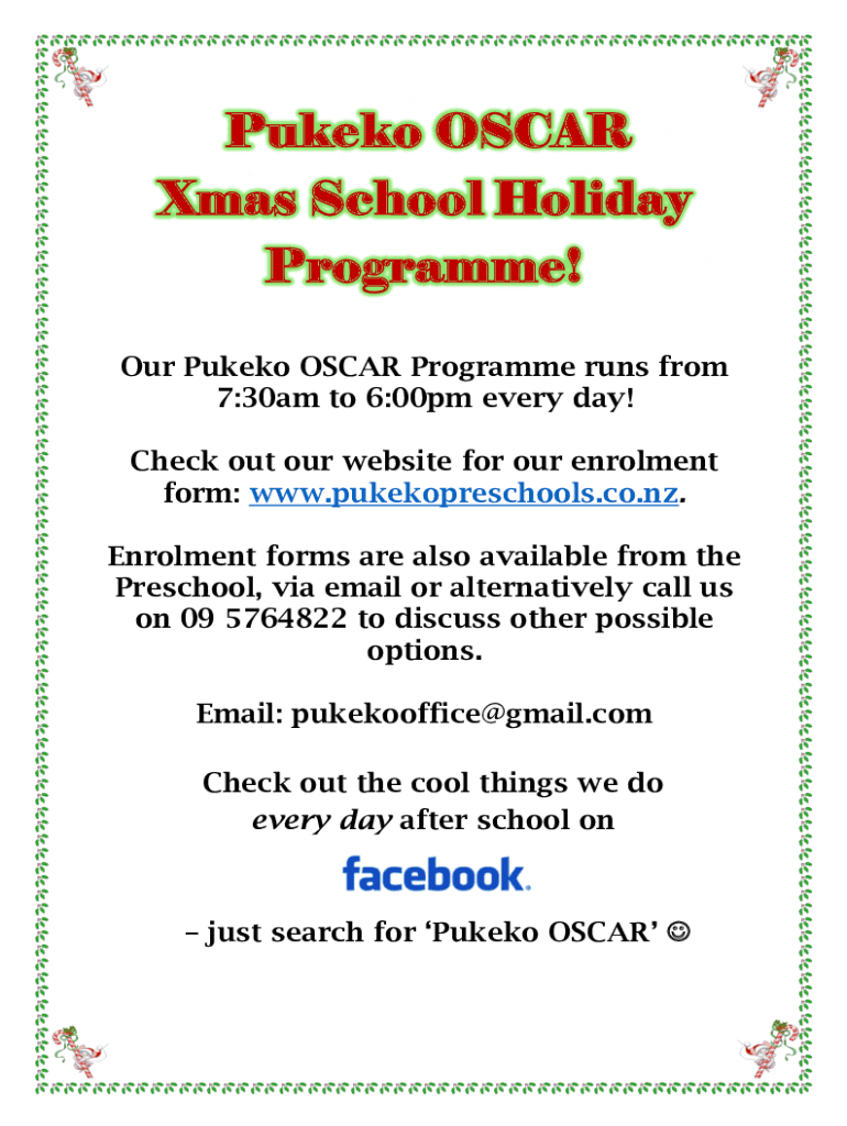 Puke OSCAR Xmas School Holiday Program! Our Puke OSCAR Program runs from 7:30am to 6:00pm every day! Check out our website for our enrollment form: www.pukekopreschools.co.nz. Enrollment forms are