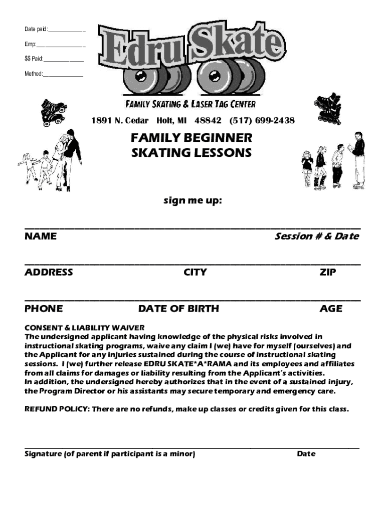 Date paid:___ EMP:___ $$ Paid:___ Method:___1891 N. Cedar Holt, MI 48842 (517) 6992438FAMILY BEGINNER SKATING LESSONS sign me up: ___ NAME Session # & Date ___ ADDRESS CITY ZIP ___ PHONE DATE OF BIRTH