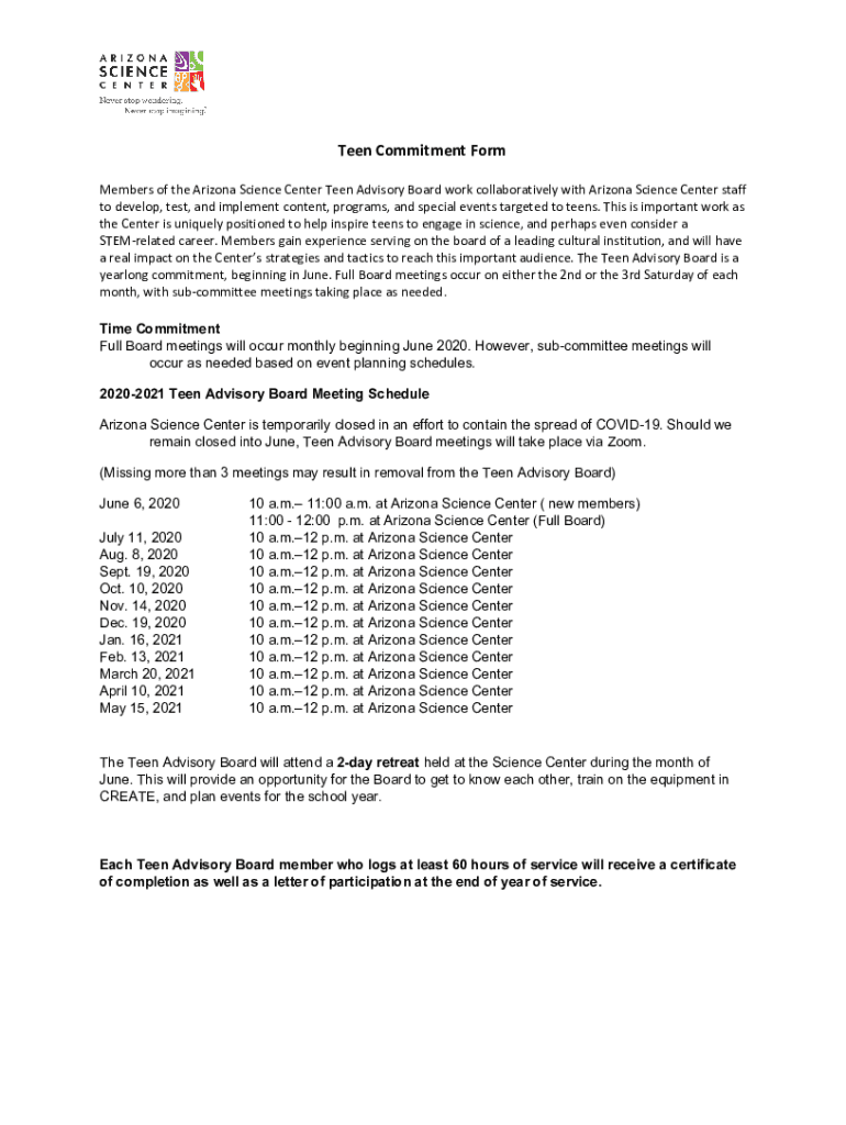 Teen Commitment Form Members of the Arizona Science Center Teen Advisory Board work collaboratively with Arizona Science Center staff to develop, test, and implement content, programs, and special