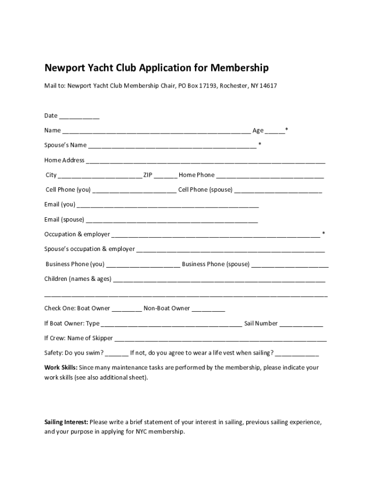 Newport Yacht Club Application for Membership Mail to: Newport Yacht Club Membership Chair, PO Box 17193, Rochester, NY 14617Date ___ Name ___ Age ___* Spouses Name ___ * Home Address ___ City ___