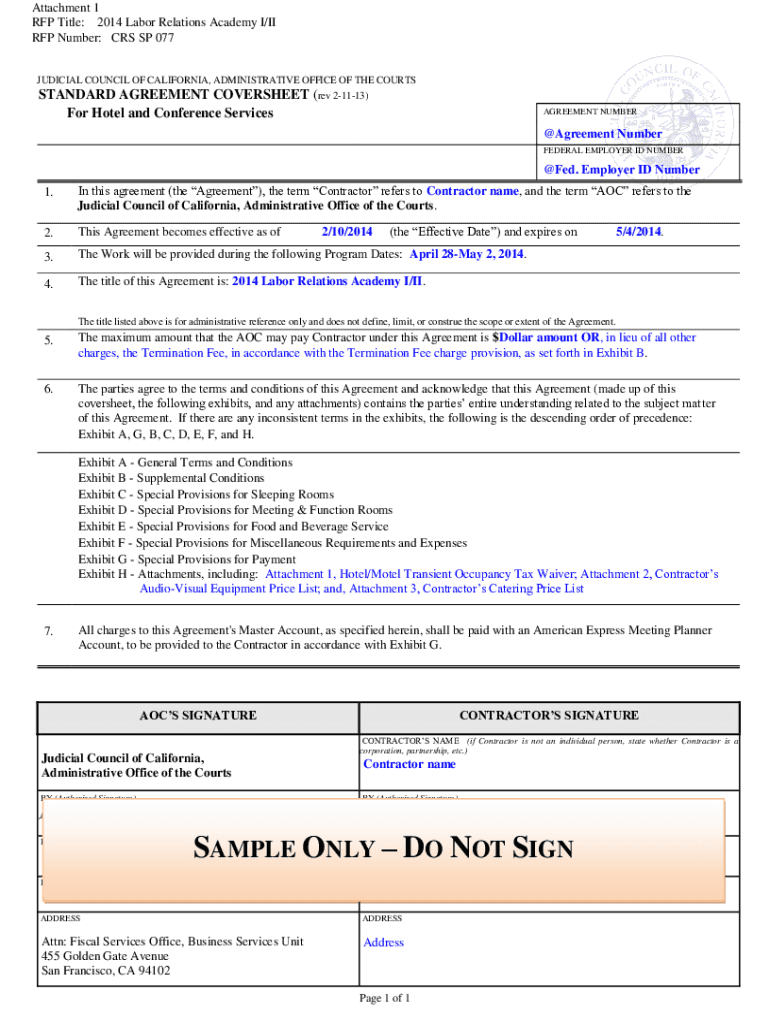 Attachment 1 RFP Title: 2014 Labor Relations Academy I/II RFP Number: CRS SP 077JUDICIAL COUNCIL OF CALIFORNIA, ADMINISTRATIVE OFFICE OF THE COURTS STANDARD AGREEMENT OVERSEE (rev 21113)For Hotel