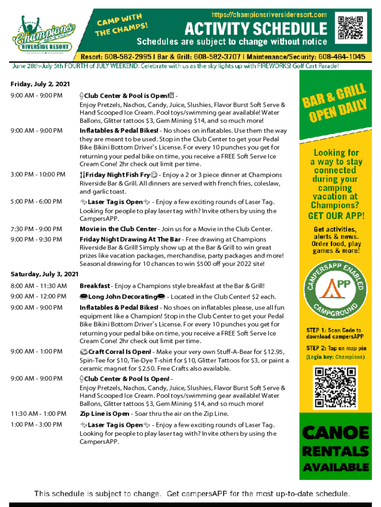 Friday, July 2, 2021 9:00 AM 9:00 Club Center & Pool is Open! Enjoy Pretzels, Nachos, Candy, Juice, Slushies, Flavor Burst Soft Serve & Hand Scooped Ice Cream. Pool toys/swimming gear available! Water