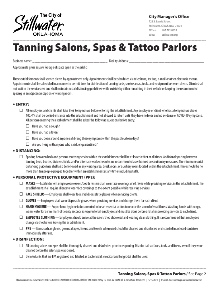 City Manager\'s Office 723 S. Lewis Street Stillwater, Oklahoma 74074 Office:405.742.8209 Web: Stillwater. Obtaining Salons, Spas & Tattoo Parlors Business name:___ Facility Address:___ Approximate