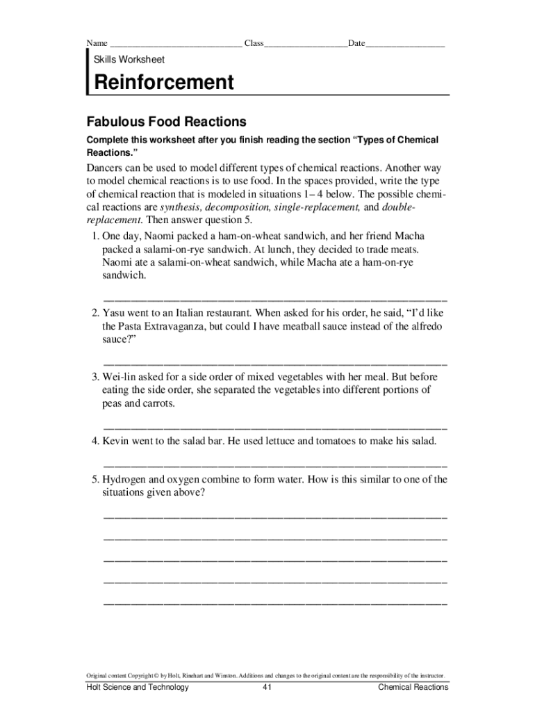 Name ___ Class___Date___Skills WorksheetReinforcement Fabulous Food Reactions Complete this worksheet after you finish reading the section Types of Chemical Reactions. Dancers can be used to model