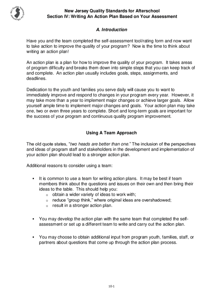 New Jersey Quality Standards for After school Section IV: Writing An Action Plan Based on Your Assessment A. Introduction Have you and the team completed the self assessment tool/rating form and now