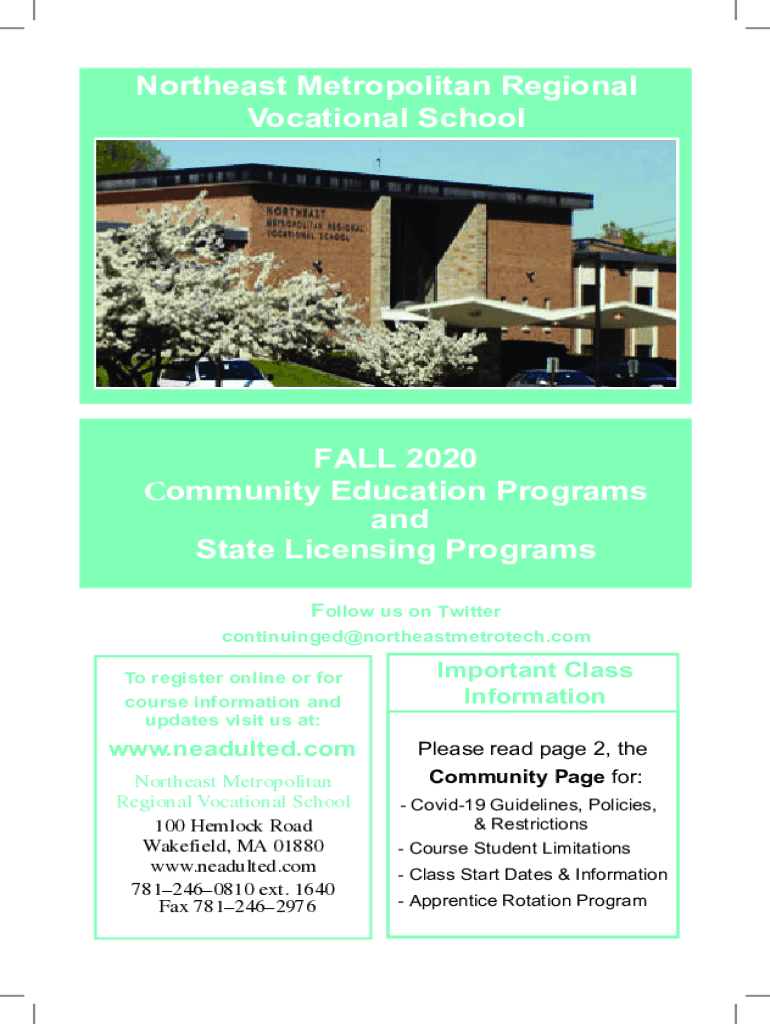 Northeast Metropolitan Regional Vocational Schoolgirl 020 community Education Programs and State Licensing Programs Follow us on Twitter continuinged@northeastmetrotech.com To register online or for