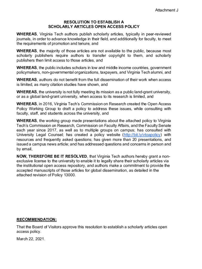Attachment J RESOLUTION TO ESTABLISH A SCHOLARLY ARTICLES OPEN ACCESS POLICY WHEREAS, Virginia Tech authors publish scholarly articles, typically in peer reviewed journals, in order to advance knowledge