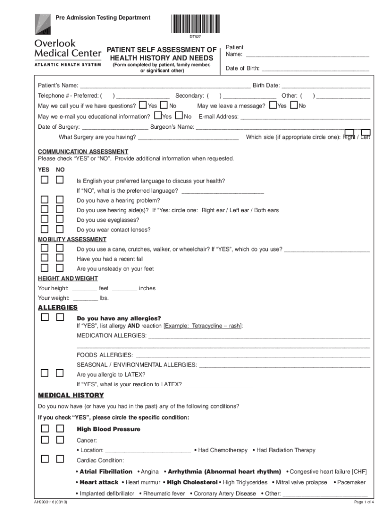PRE Admission Testing Department×DT527* DT527Reset Formation Name: ___PATIENT SELF ASSESSMENT OF HEALTH HISTORY AND NEEDS (Form completed by patient, family member, or significant other)Date of Birth: