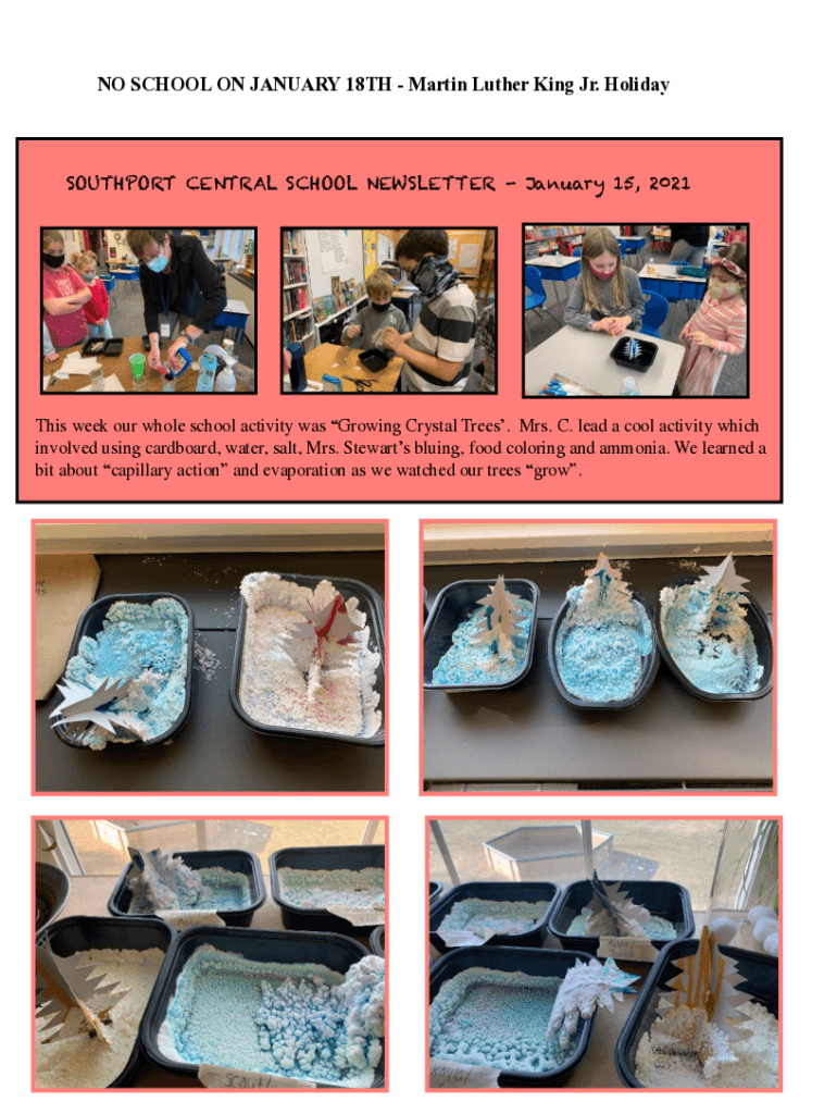 NO SCHOOL ON JANUARY 18TH Martin Luther King Jr. HolidaySOUTHPORT CENTRAL SCHOOL NEWSLETTER January 15, 2021. This week our whole school activity was Growing Crystal Trees. Mrs. C. lead a cool activity