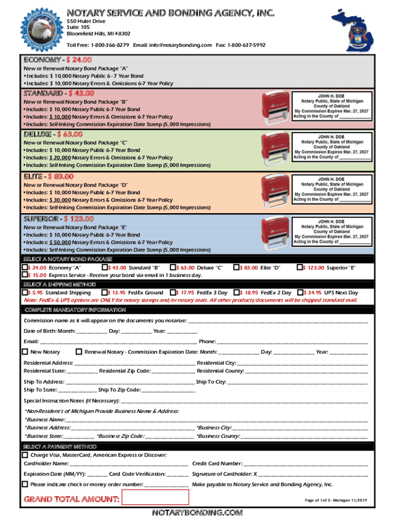 NOTARY SERVICE AND BONDING AGENCY, INC. 550 Let Drive Suite 105 Bloomfield Hills, MI 48302 Toll Free: 18003668279 Email: info@notarybonding.com Fax: 18006375992ECONOMY $24.00 New or Renewal Notary
