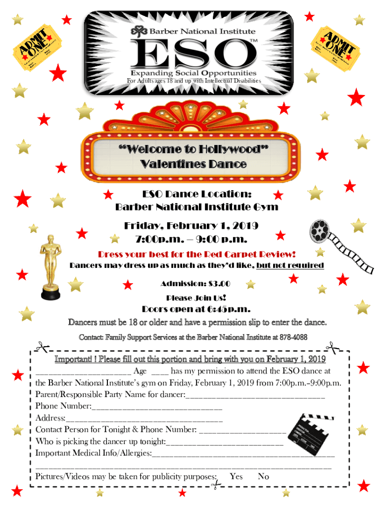 For Adults ages 18 and up with Intellectual DisabilitiesWelcome to Hollywood Valentines Dance ESO Dance Location: Barber National Institute Gym Friday, February 1, 2019 7:00p.m. 9:00 p.m. Dress your