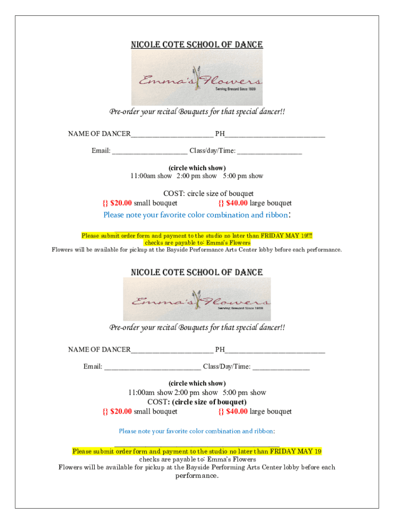 NICOLE COTE SCHOOL OF DANCEPreorder your recital Bouquets for that special dancer!! NAME OF DANCER___ PH___ Email: ___ Class/day/Time: ___ (circle which show) 11:00am show 2:00 pm show 5:00 pm showcase: