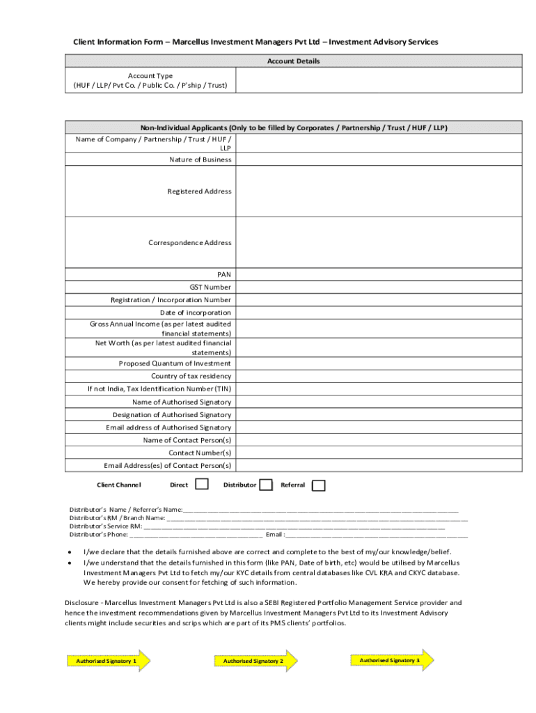 Client Information Form Marcellus Investment Managers Pvt Ltd Investment Advisory Services Account Details Account Type (HUF / LLP/ Pvt Co. / Public Co. / P\'ship / Trust)Individual Applicants (Only
