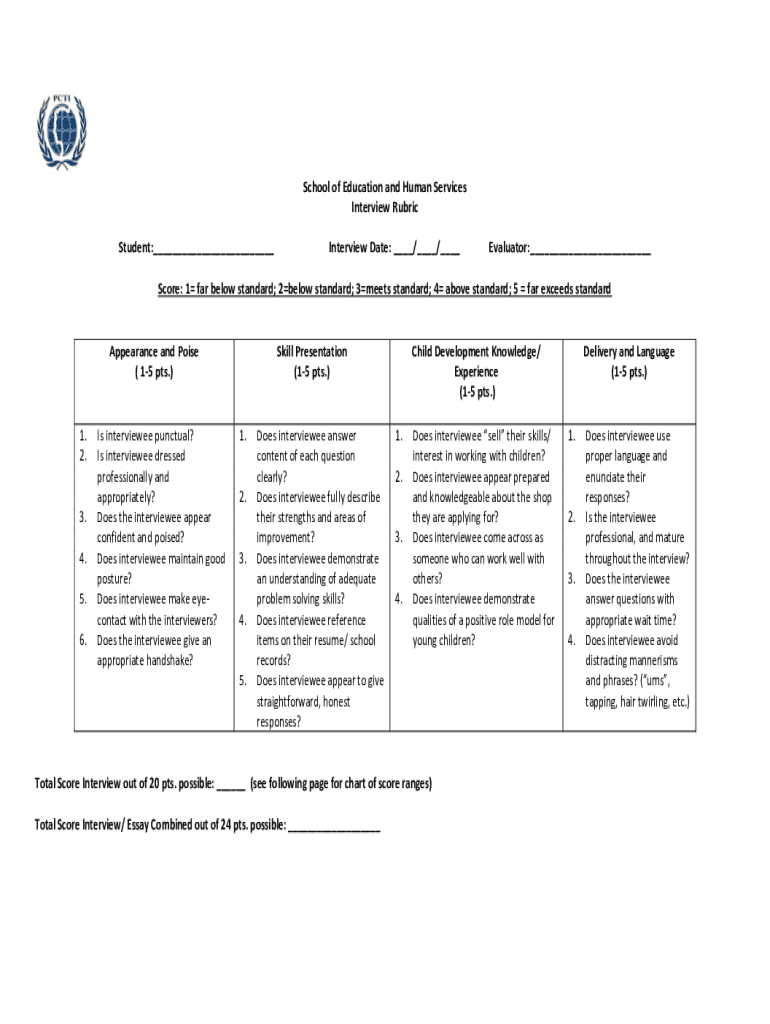 School of Education and Human Services Interview Rubric Student:___Interview Date: ___/___/___Evaluator:___Score: 1 far below standard; 2below standard; 3meets standard; 4 above standard; 5 far exceeds