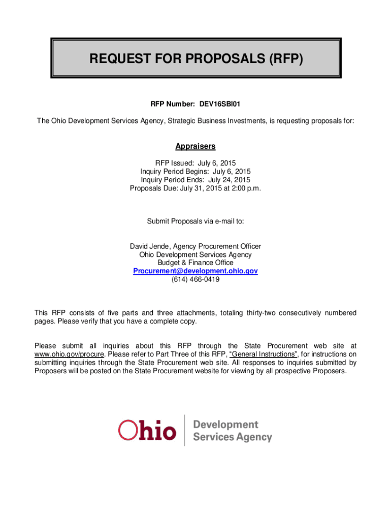 REQUEST FOR PROPOSALS (RFP)RFP Number: DEV16SBI01 The Ohio Development Services Agency, Strategic Business Investments, is requesting proposals for:Appraisers RFP Issued: July 6, 2015, Inquiry Period